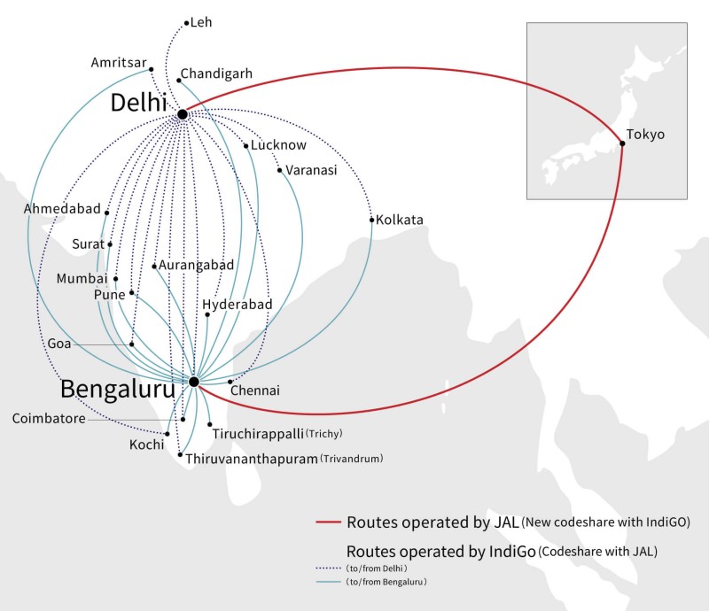 JAL은 인도 최대 국내선 네트워크를 운영하는 인디고항공과의 코드셰어 협력을 확대했다. 일본-인도 간 JAL 운항 노선이 포함되어 양국을 오가는 승객들에게 원활한 연결성을 제공한다.