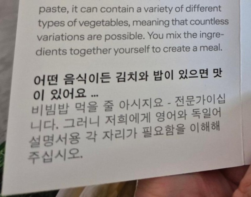 그런데 한글 부분은 달랐다. "어떤 음식이든 김치와 밥이 있으면 맛이 있어요... 비빔밥 먹을 줄 아시지요 - 전문가이십니다. 그러니 저희에게 영어와 독일어 설명서용 각 자리가 필요함을 이해해 주십시오"라는 내용이 적혀 있었다.